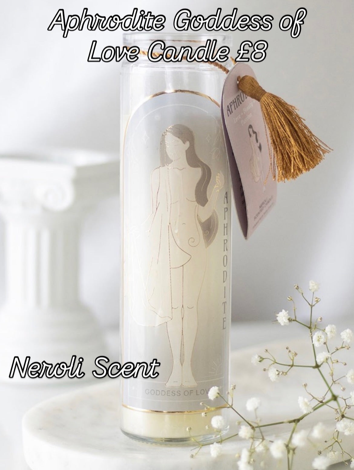 This beautiful scented Goddess Aphrodite Candle burns for 8 hrs plus.